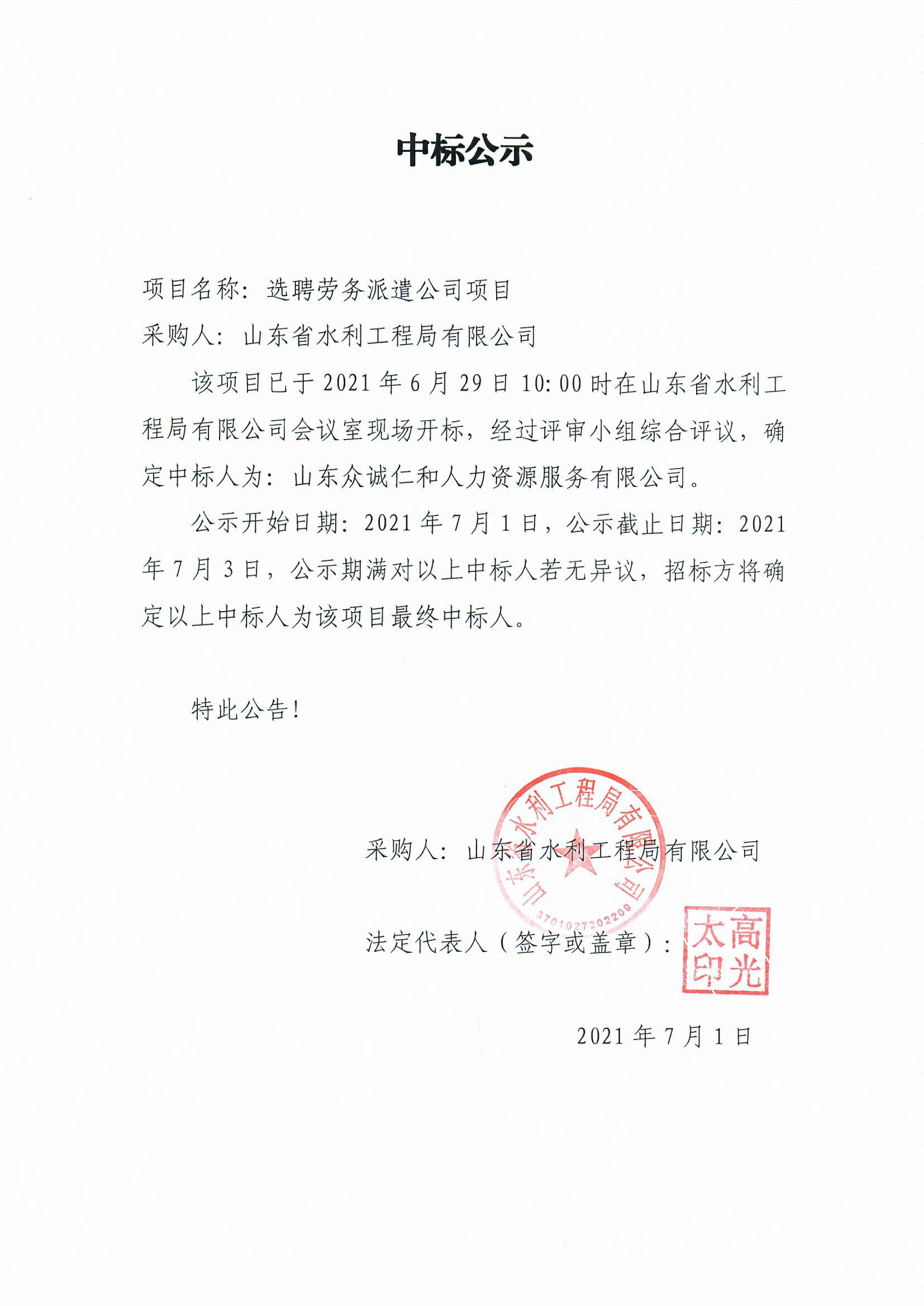 選聘勞務(wù)派遣公司項目中標公示