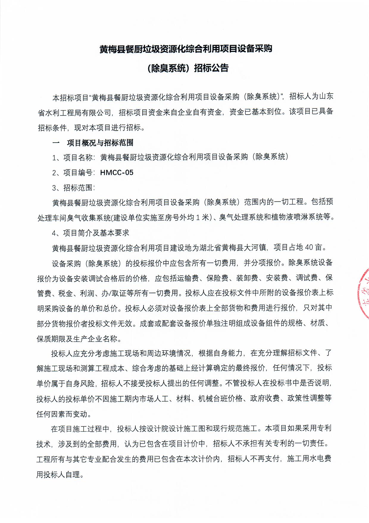 黃梅縣餐廚垃圾資源化綜合利用項目設備采購 (除臭系統(tǒng))招標公告