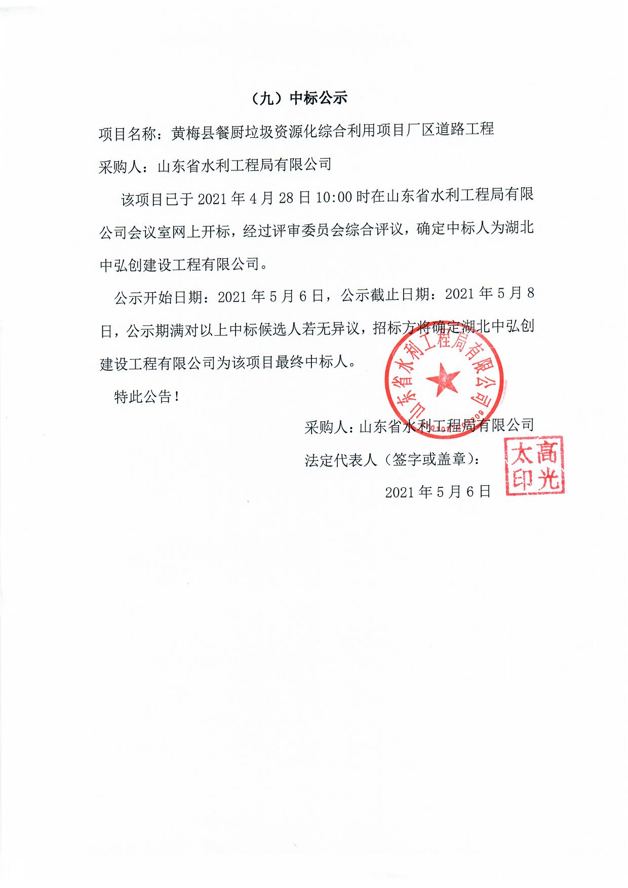 黃梅縣餐廚垃圾資源化綜合利用項(xiàng)目廠區(qū)道路工程中標(biāo)公示