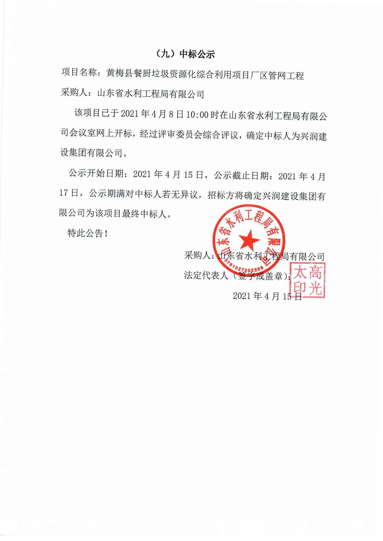 山東省水利工程局有限公司餐廚垃圾處理廠智能信息化管控平臺中標(biāo)候選人公示