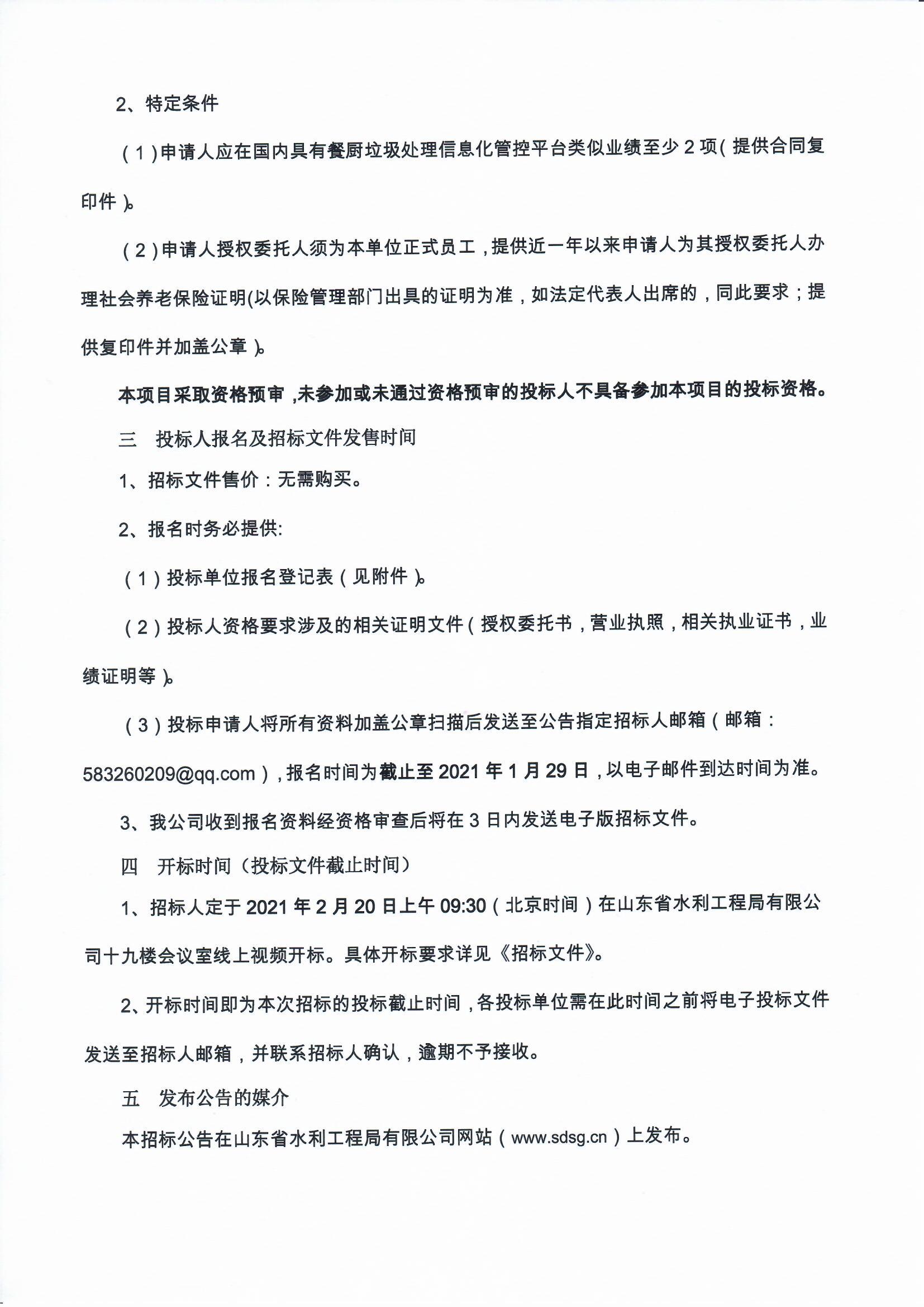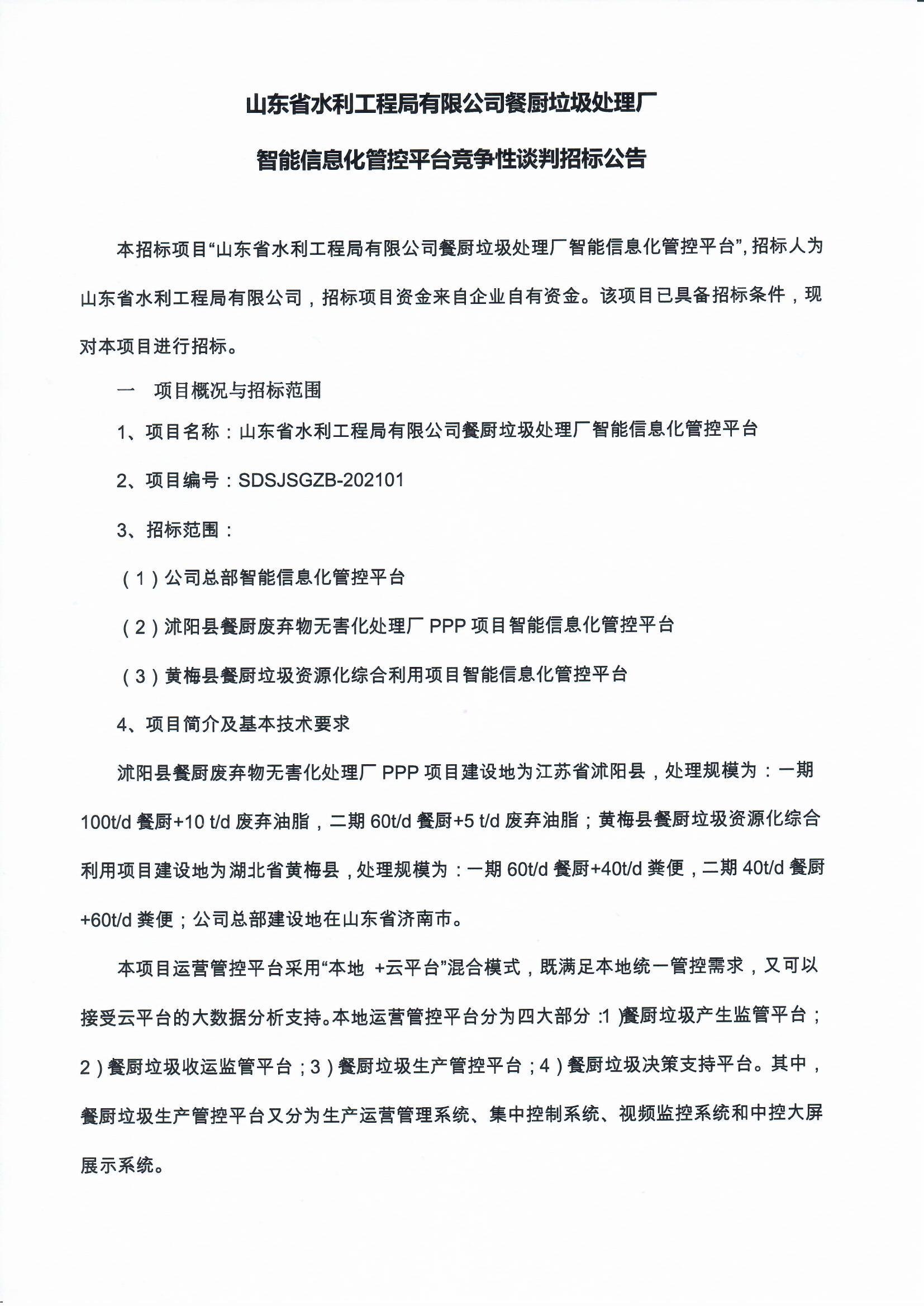 山東省水利工程局有限公司餐廚垃圾處理廠智能信息化管控平臺競爭性談判招標(biāo)公告