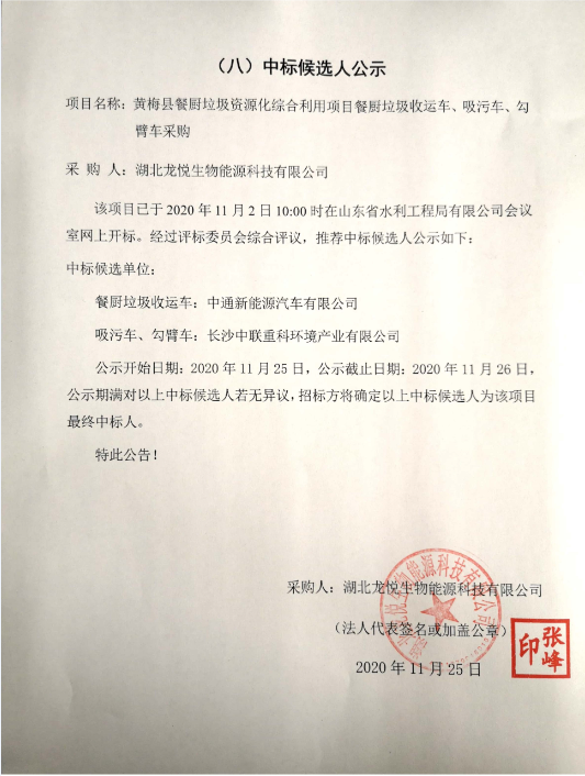 黃梅縣餐廚垃圾資源化綜合利用項(xiàng)目餐廚垃圾收運(yùn)車、吸污車、勾臂車采購中標(biāo)候選人公示