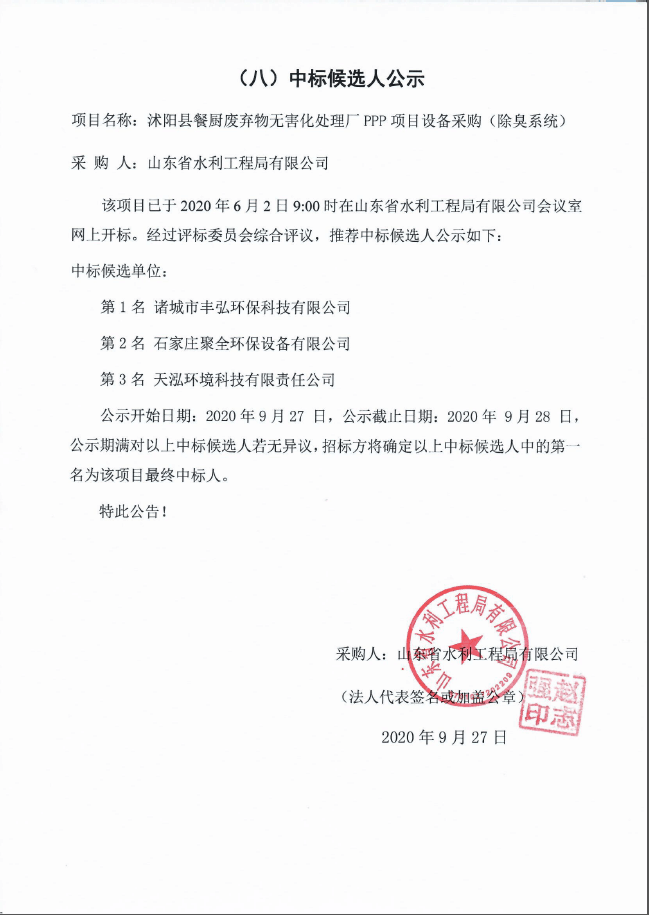 沭陽縣餐廚廢棄物無害化處理廠PPP項目設備采購(除臭系統(tǒng))中標候選人公示