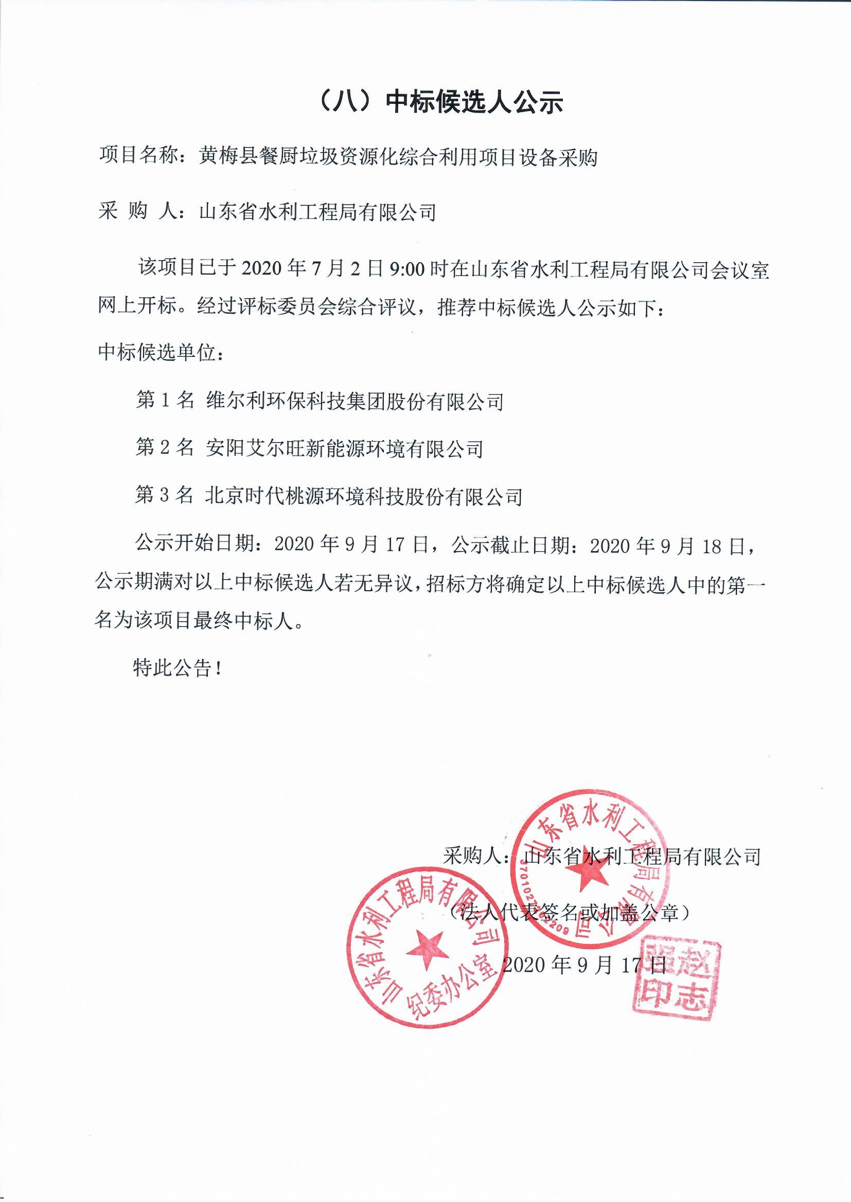 黃梅縣餐廚垃圾資源化綜合利用項目設(shè)備采購中標(biāo)候選人公示