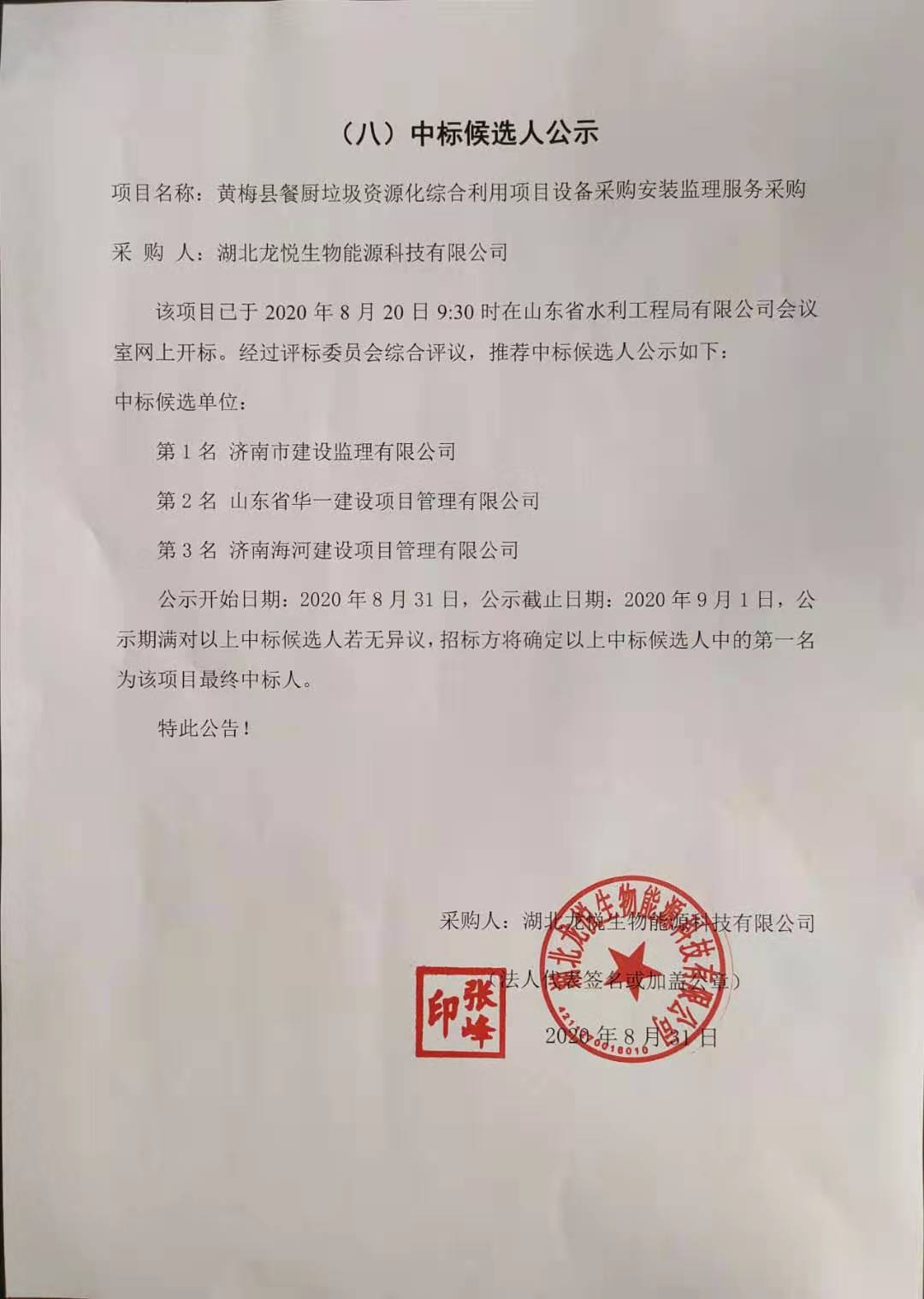 黃梅縣餐廚垃圾資源化綜合利用項目設(shè)備采購安裝監(jiān)理服務采購中標候選人公示