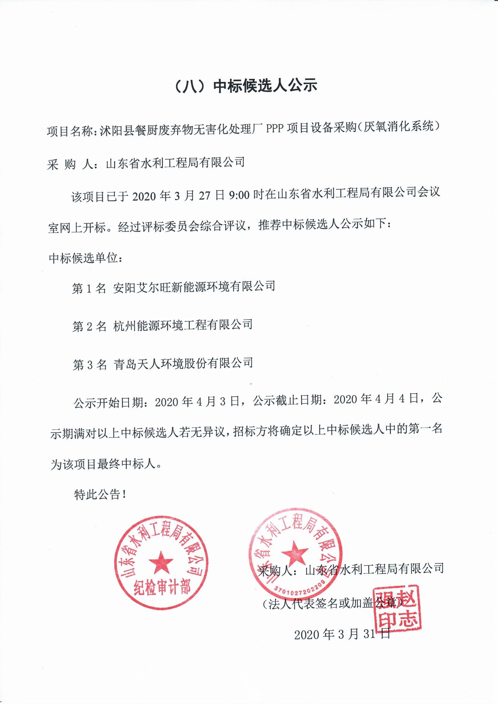 沭陽縣餐廚廢棄物無害化處理廠PPP項目設(shè)備采購(厭氧消化系統(tǒng))中標候選人公示