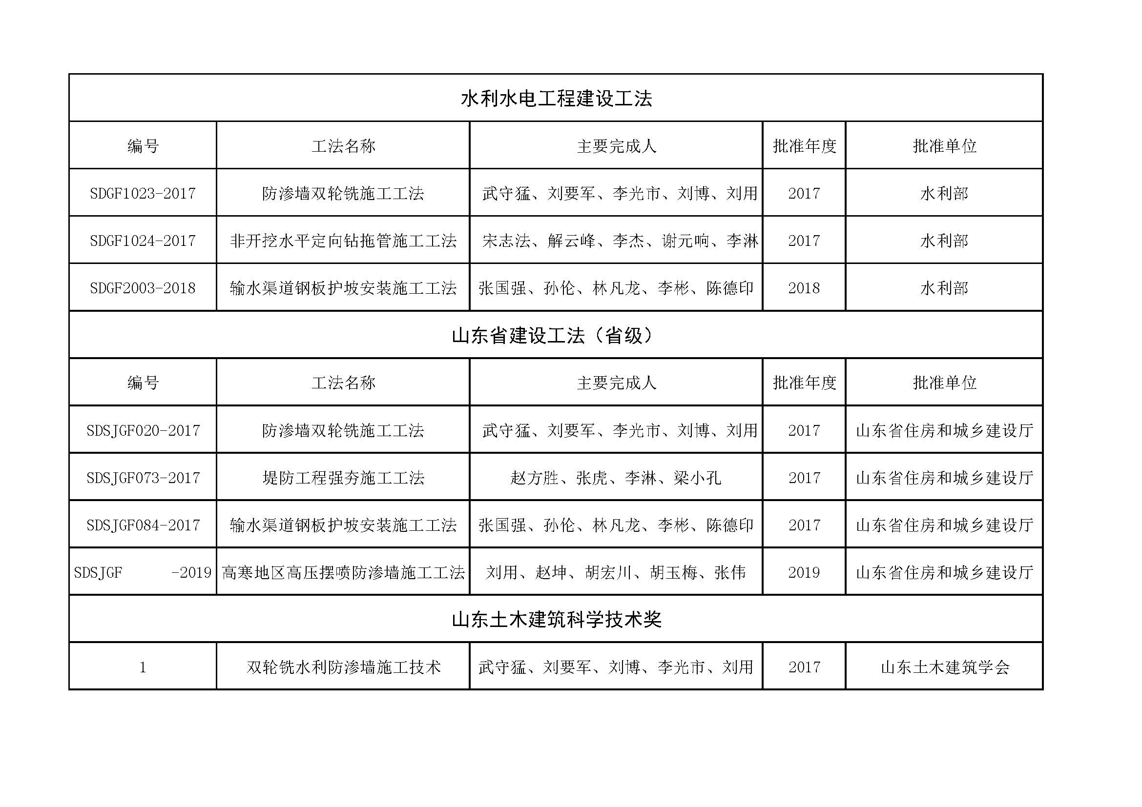 水利水電工程建設(shè)工法(部級(jí))、山東省省級(jí)工程建設(shè)工法情況